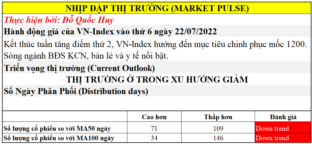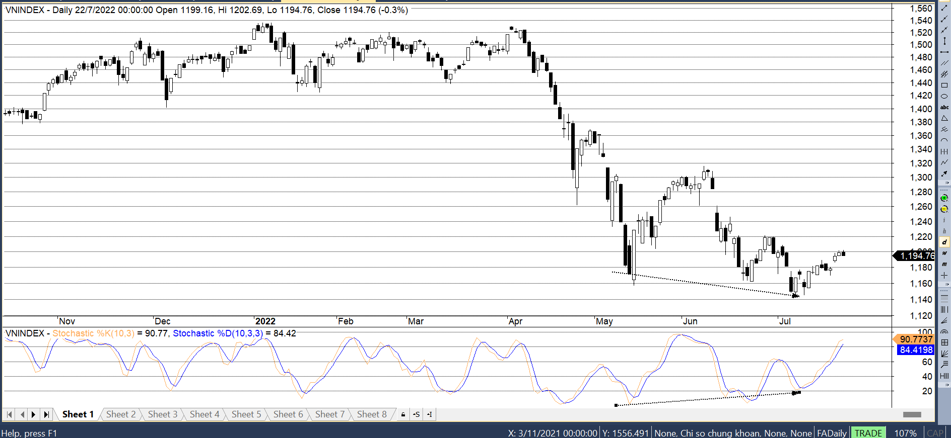 Chỉ số VN-Index có tuần tăng giá thứ 2 liên tiếp sau khi tạo đáy mới vào tuần đầu tháng 7. Tin vui cho nhiều nhà đầu tư khi ngày Bùng nổ theo đà (FTD) cuối cùng đã xuất hiện và đem đến kịch bản có xác suất cao thị trường tạo đáy thành công. Chỉ số VN-Index kết thúc phiên giao dịch đóng cửa tại 1,194.76 (-0.31%) với khối lượng thấp hơn phiên hôm trước.