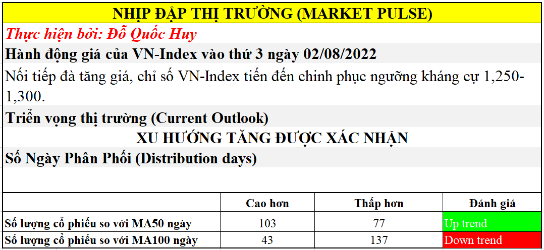 Hộp NHỊP ĐẬP THỊ TRƯỜNG chúng tôi đã chuyển sang đèn xanh, tức “XU HƯỚNG TĂNG ĐƯỢC XÁC NHẬN”. Điều kiện thị trường đã tốt hơn so với 1 tháng trước đây, tuy nhiên hãy nên nhớ chỉ số thị trường vừa chỉ mới thoát khỏi một vũng đầm lầy và rủi ro hiện tại vẫn còn khá lớn.