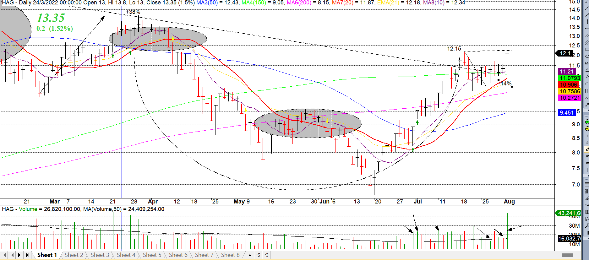 Cổ phiếu HAG phiên giao dịch hôm nay chứng kiến sự bùng nổ về giá lẫn khối lượng, cuối phiên HAG đóng cửa trong sắp tím. Cổ phiếu HAG đang tiến đến điểm pivot 12.15 của mẫu hình Chiếc Cốc tay cầm và hôm nay là điểm mua sớm khi HAG breakout đường downtrendline ở phần tay cầm. Khối lượng giao dịch cạn kiệt tại tay cầm và thời gian hình thành 2 tuần đủ để đáp ứng cho phần tay cầm tiêu chuẩn. Độ sâu của phần tay cầm ở mức cho phép -14%.