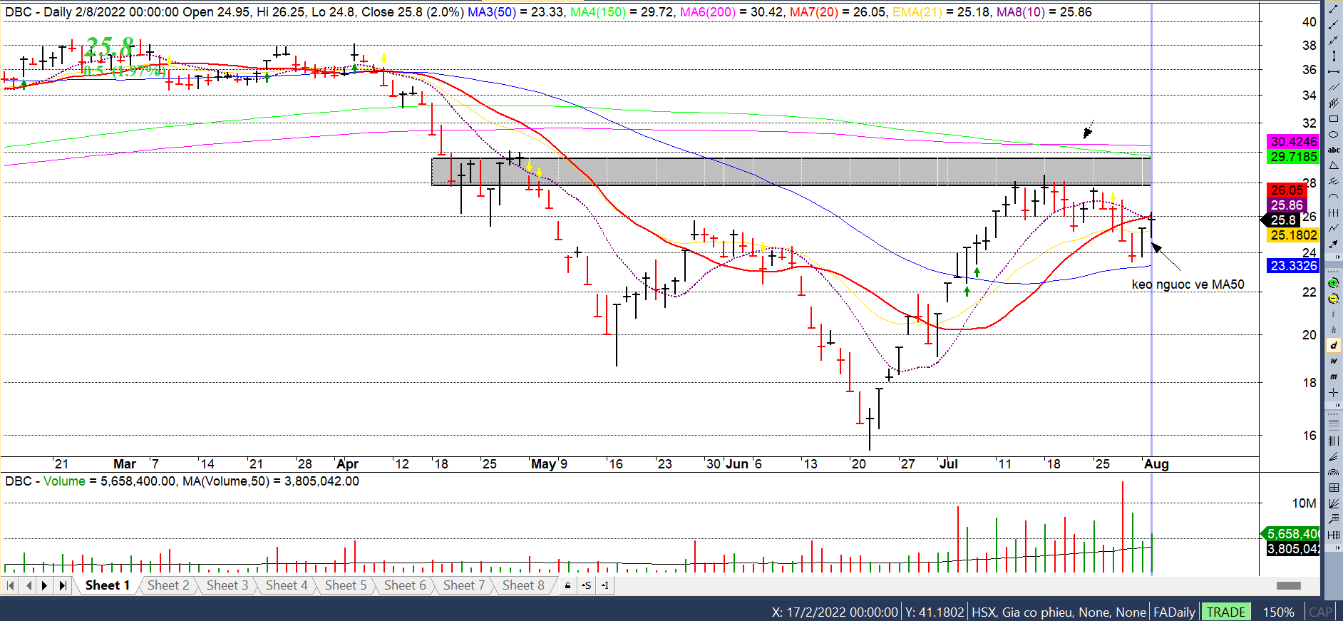 Sự phân hoá đang diễn ra ngày càng mạnh giữa các cổ phiếu chung nhóm ngành. Trong khi HAG đang chuẩn bị breakout khỏi mẫu hình Cốc tay cầm thì BAF vẫn đang loay hoay tìm kiếm sự hỗ trợ ngay tại MA150 ngày. Cổ phiếu DBC thì tốt hơn khi bật tăng mạnh trở lại sau khi kéo ngược về MA50 ngày, tuy nhiên MA200 ngày vẫn đang là vùng kháng cự cứng mà DBC cần phải nhanh chóng vượt qua.
