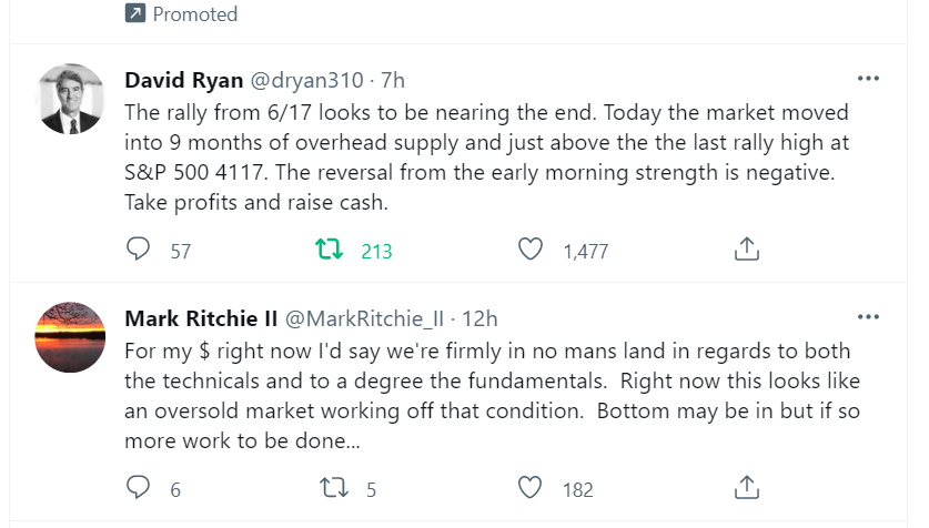 David Ryan cho rằng đợt hồi phục từ đáy ngày 17 tháng 6 có thể gần kết thúc. Cú đảo chiều giảm sáng hôm nay có vẻ tiêu cực. Hãy chốt lãi và tăng nắm giữ tiền mặt.