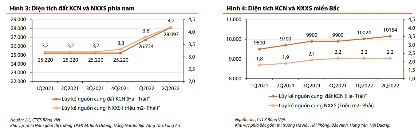 Theo số liệu từ CTCK Rồng Việt, nguồn cung đất công nghiệp ở khu vực phía Bắc đang chậm lại (chỉ tăng 254 ha trong 6 tháng đầu năm) trong khi nguồn cung ở khu vực miền Nam tăng mạnh 3,131 ha.