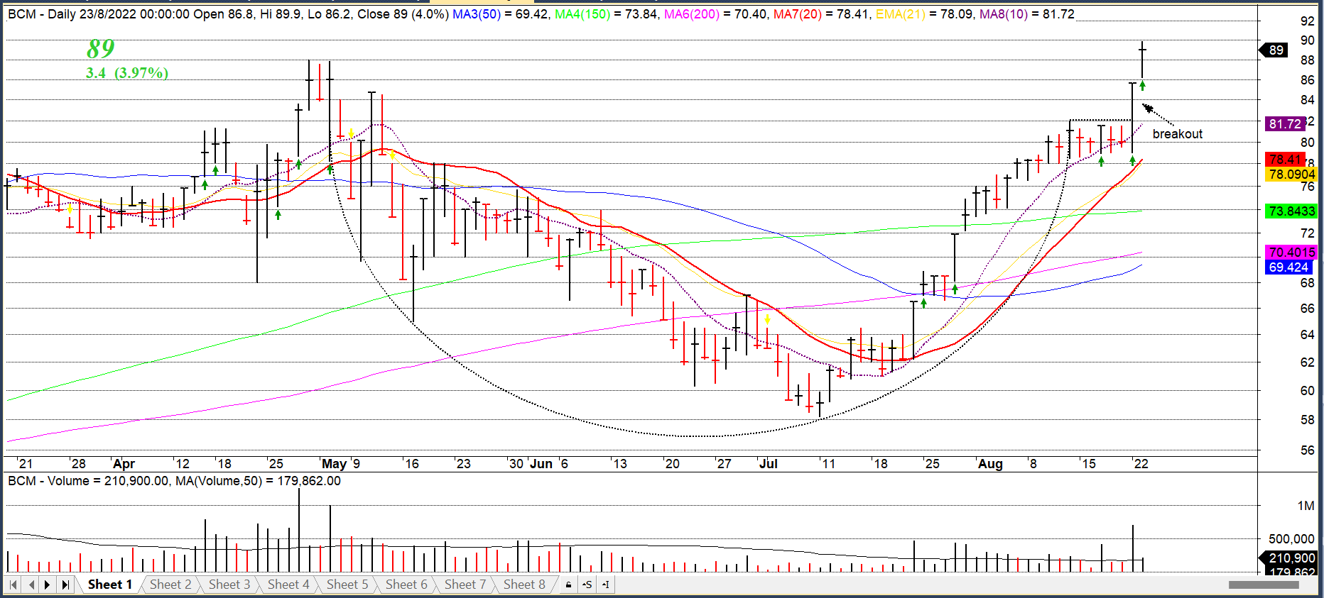Bên cạnh VGC thì BCM cũng mới tham gia vào nhóm cổ phiếu dẫn dắt thị trường ngay sau khi breakout thành công mẫu hình Chiếc Cốc tay cầm với volume lớn vào ngày hôm qua. Cổ phiếu BCM tiếp tục có ngày tăng giá 4% và rời xa vùng mua hợp lý +5% từ điểm pivot mẫu hình Chiếc Cốc tay cầm.