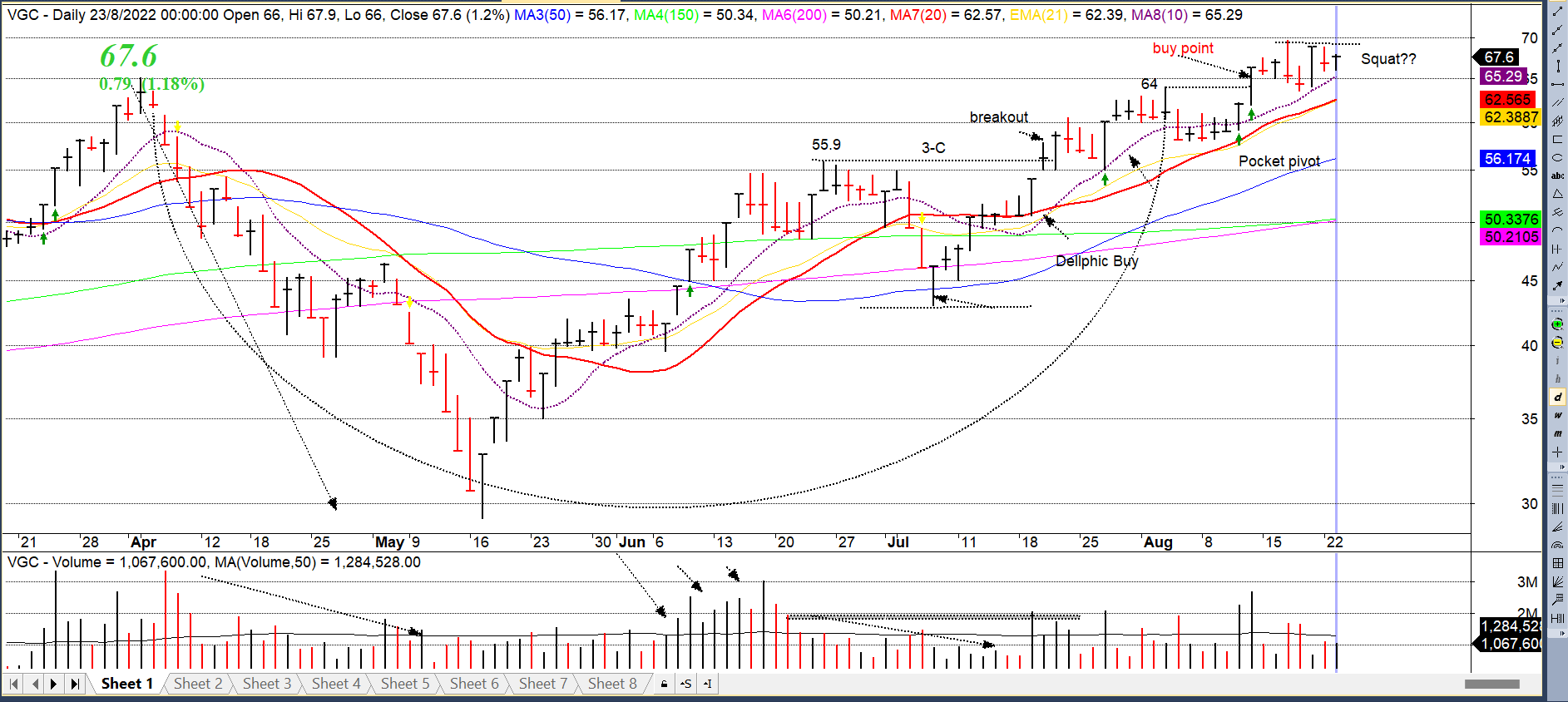Nói về các cổ phiếu dẫn dắt, chúng ta đang có sóng ngành BĐS KCN là nổi trội nhất với số lượng cổ phiếu dẫn đầu nhiều nhất ở thời điểm hiện tại. Cổ phiếu VGC đã breakout thành công mẫu hình Chiếc Cốc tay cầm và hiện đang được Team NĐT CANSLIM quan sát khả năng Squat (bật dậy) thành công hay không?