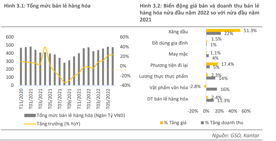 2.Xét về tiềm năng tăng trưởng cho cả ngành, tổng mức bán hàng hoá và doanh thu dịch vụ tiêu dùng 6 tháng đầu năm 2022 đạt mức 2,717 ngàn tỷ đồng (+11.7% so với cùng kỳ). Mức tăng trưởng của toàn ngành đến từ 2 yếu tố chính: (1) nhóm bán lẻ hàng hoá tăng 11.3% y-o-y và giá bán hàng hoá tiếp tục tăng khi giá nhiên liệu tăng cao; (2) nhóm ngành dịch vụ lưu trú ăn uống (+20.9% YoY) và du lịch lữ hành (+94.4% YoY) do các hoạt động vui chơi, giải trí và du lịch tái khởi động sau dịch.