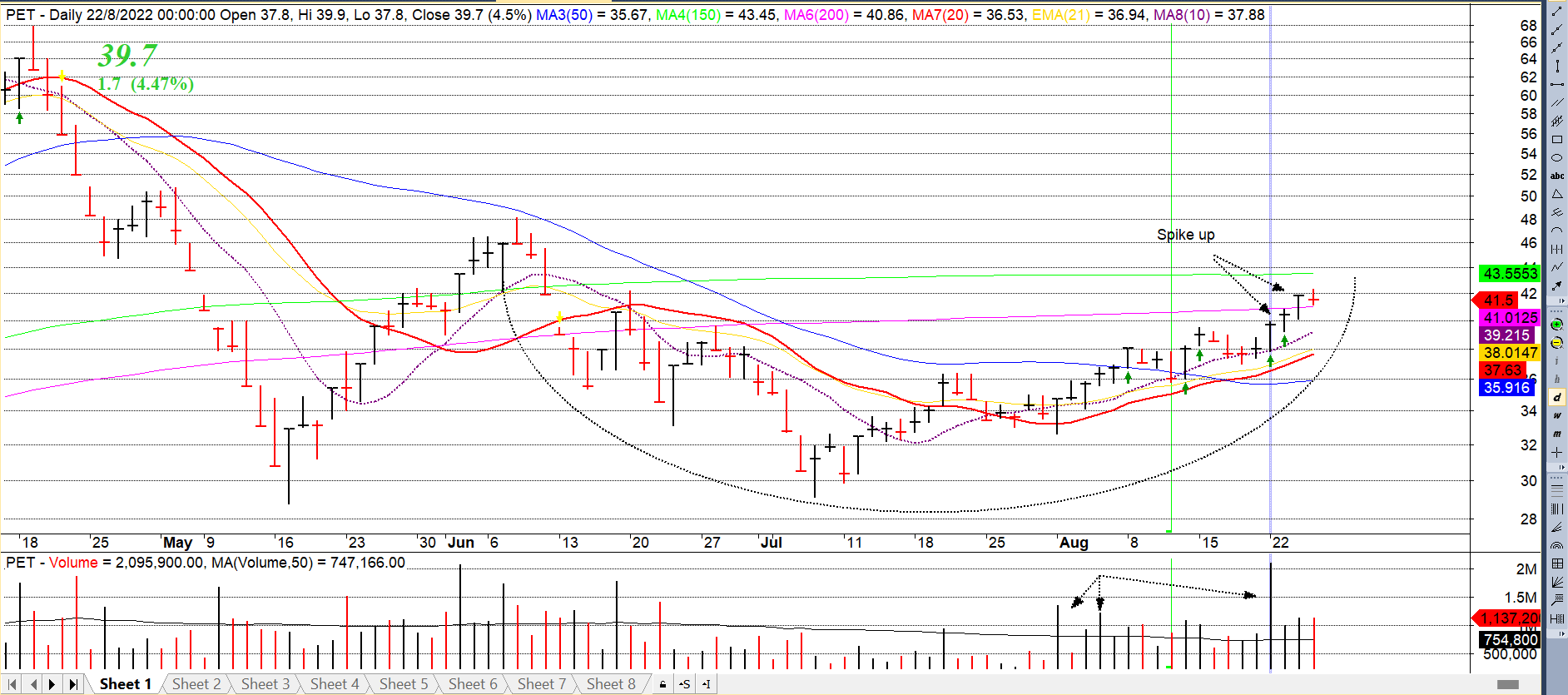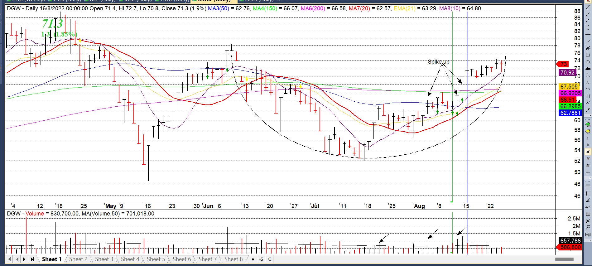 1.Về chart giá, các cổ phiếu thuộc nhóm bán lẻ như PNJ, FRT, DGW, PET đã cho thấy dấu hiệu hoàn thành bên phía mạn phải của mẫu hình khi lần lượt có những ngày tăng giá vượt qua MA50 ngày với khối lượng lớn. Khối lượng tĩnh lặng tại đáy cho thấy nguồn cung đã ngừng đổ vào và bên mạn phải chúng tôi quan sát thấy nhiều thanh giá tăng đi kèm với khối lượng lớn cho thấy dòng tiền tổ chức đang tham gia vào.