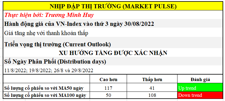 Xu hướng tăng giá của VN-Index vẫn được duy trì khi giữ được EMA 21 ngày. Mặc dù có 4 ngày phân phối đã xuất hiện nhưng nhìn chung chỉ có ngày phân phối 11 tháng 8 là mạnh, ngoài ra các ngày phân phối khác được cho là khá nhẹ.