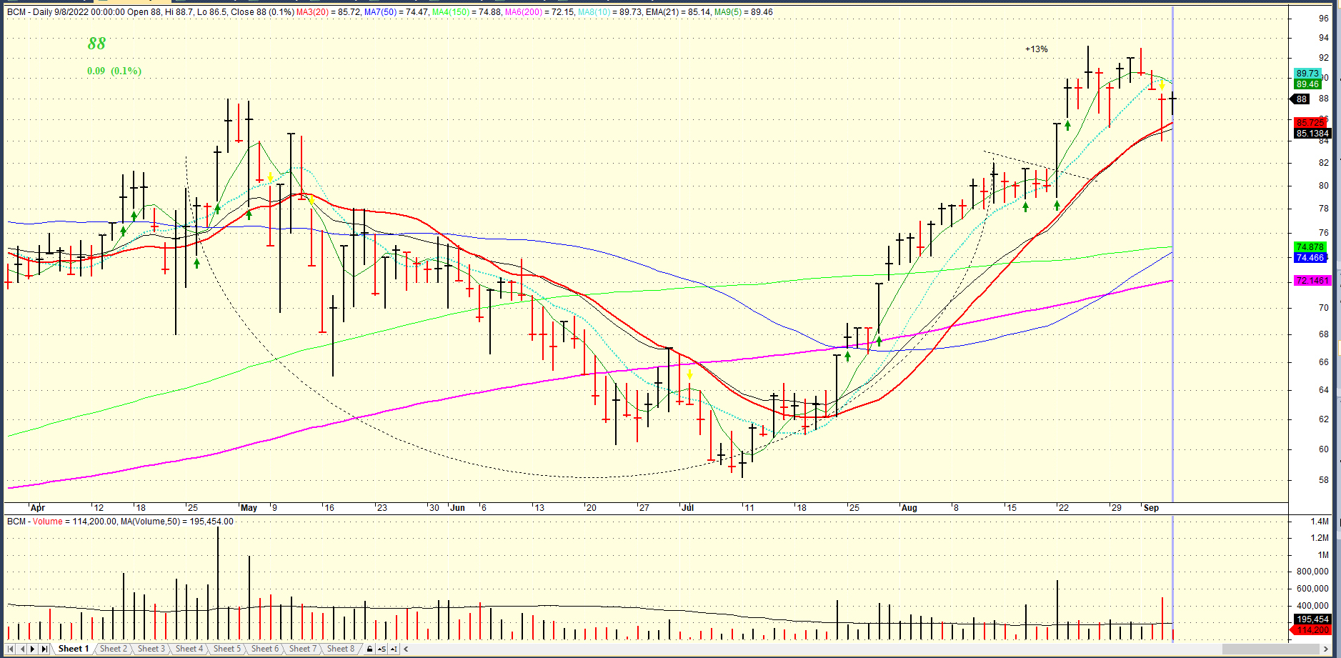 Quan sát tình hình sức khỏe của các cổ phiếu dẫn dắt là cách làm dễ nhất để đánh giá về sức khỏe của thị trường chung. Ngoài VGC thì cổ phiếu BCM cũng là Leader trong sóng tăng giá lần này, BCM có vẻ khởi sắc hơn khi vẫn đóng cửa trên MA20 ngày. Tuy nhiên hãy luôn bật chế độ phòng vệ nếu như BCM quay trở lại điểm pivot và xóa sạch mức lãi mà nó tạo ra trước đó, Quy tắc Bán khứ hồi lại được một lần nữa áp dụng trong trường hợp này.