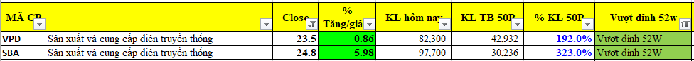 Danh sách cổ phiếu vượt đỉnh 52 tuần chỉ còn duy nhất 2 cổ phiếu thuộc nhóm ngành điện là VPD và SBA.