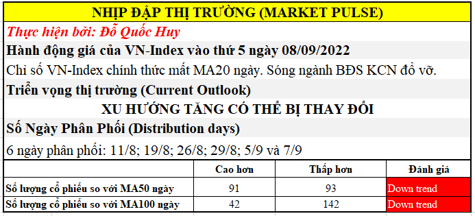 Thị trường đã có tổng cộng 6 ngày phân phối (trong đó 5 ngày phân phối nhẹ và 1 ngày phân phối mạnh), hộp Nhịp đập thị trường cũng đã chuyển sang “Xu hướng tăng có thể bị thay đổi”. Vì vậy điều cần làm bây giờ là thực hiện chiến lược phòng thủ, tiến hành tăng tỷ trọng nắm giữ tiền mặt, bán cắt lỗ thật nhanh các cổ phiếu đang có dấu hiệu “cảnh báo đỏ”. Hãy hạn chế khoản lỗ ở mức nhỏ từ 7%-8%, tuân thủ tuyệt đối nguyên tắc “bán khứ hồi” và chốt lợi nhuận (nếu có) thật sớm.
