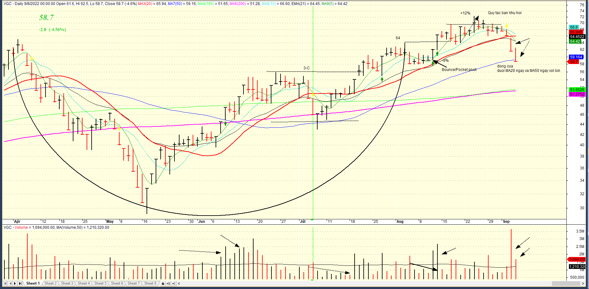 Sau phiên giảm giá phá thủng MA20 ngày với khối lượng giao dịch đột biến và cao nhất kể từ đầu năm 2022 vào ngày hôm qua. Cổ phiếu VGC đã không thể hồi phục trở lại và Quy tắc Bán khứ hồi lại một lần nữa được sử dụng khi VGC đã tăng giá 13% từ điểm pivot của mẫu hình Chiếc Cốc tay cầm nhưng lập tức xóa tan mức lãi này trong 2 phiên giao dịch vừa qua.