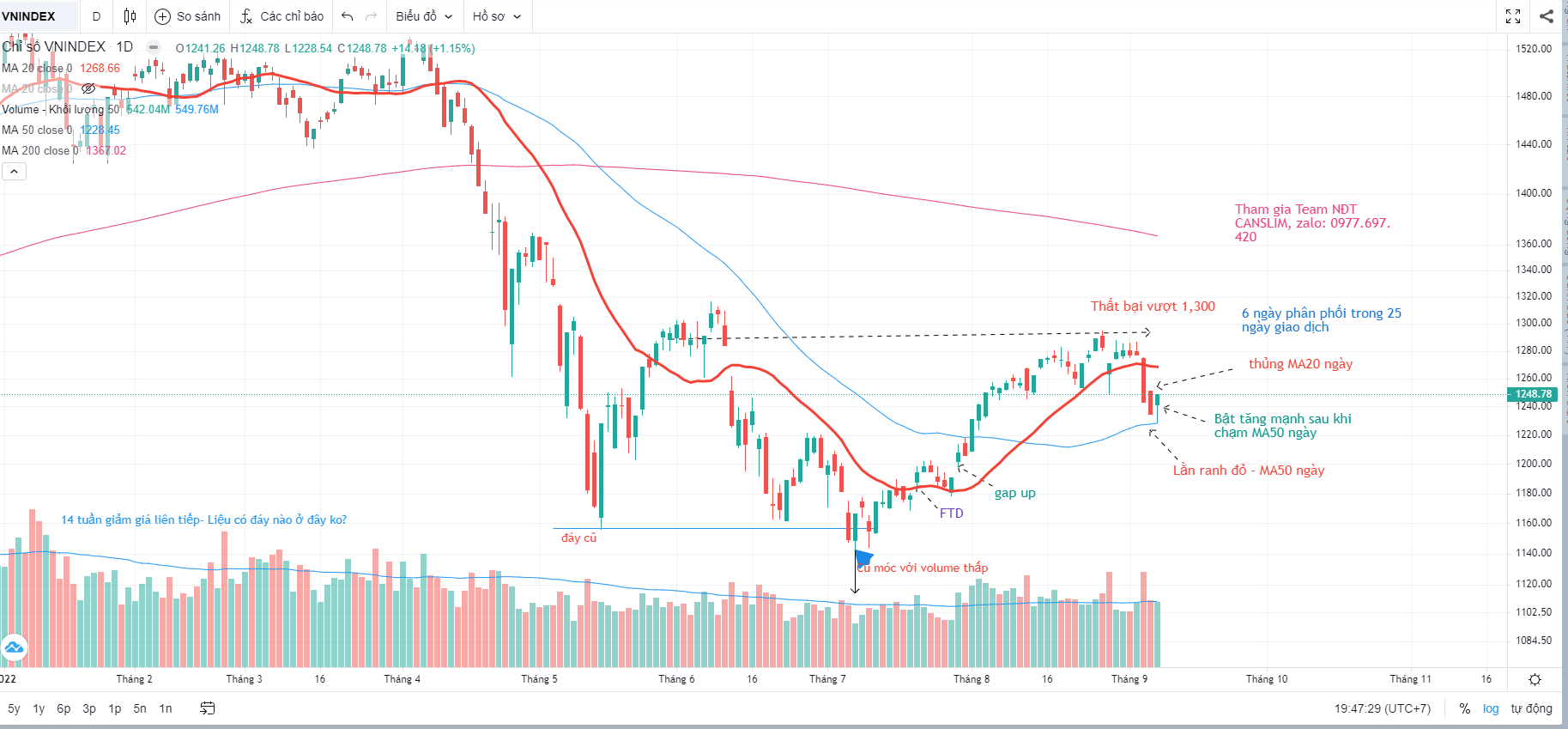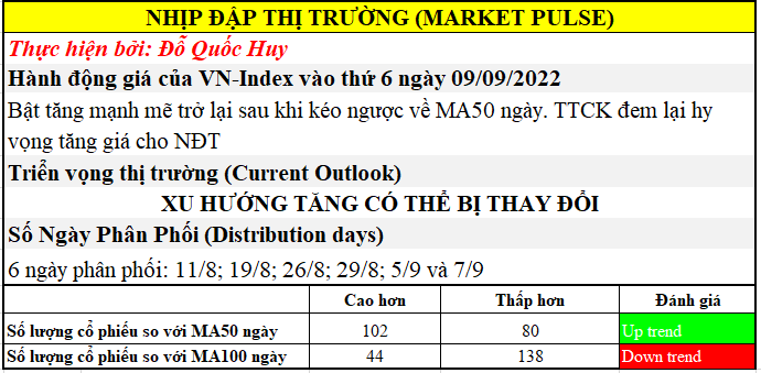 Thị trường chỉ mới có ngày đầu tiên tăng giá trở lại và điều đó chưa kể kết luận rằng mọi thứ đã trở nên an toàn. Đường trung bình di động MA20 ngày hoặc EMA21 ngày và gap down trước tạo nên vùng kháng cự khá cứng mà chỉ số VN-Index cần nhanh chóng vượt qua nếu muốn khẳng định Uptrend vẫn còn. Mục tiêu cho đợt tăng giá của thị trường chung lần này là vùng kháng cự MA200 ngày tương đương 1,367 điểm; thị trường đã tăng giá 2 tháng kể từ đáy tháng 7 và đây là khoảng thời gian cực kỳ nhạy cảm của năm 2022 mà trader cẩn chú ý.