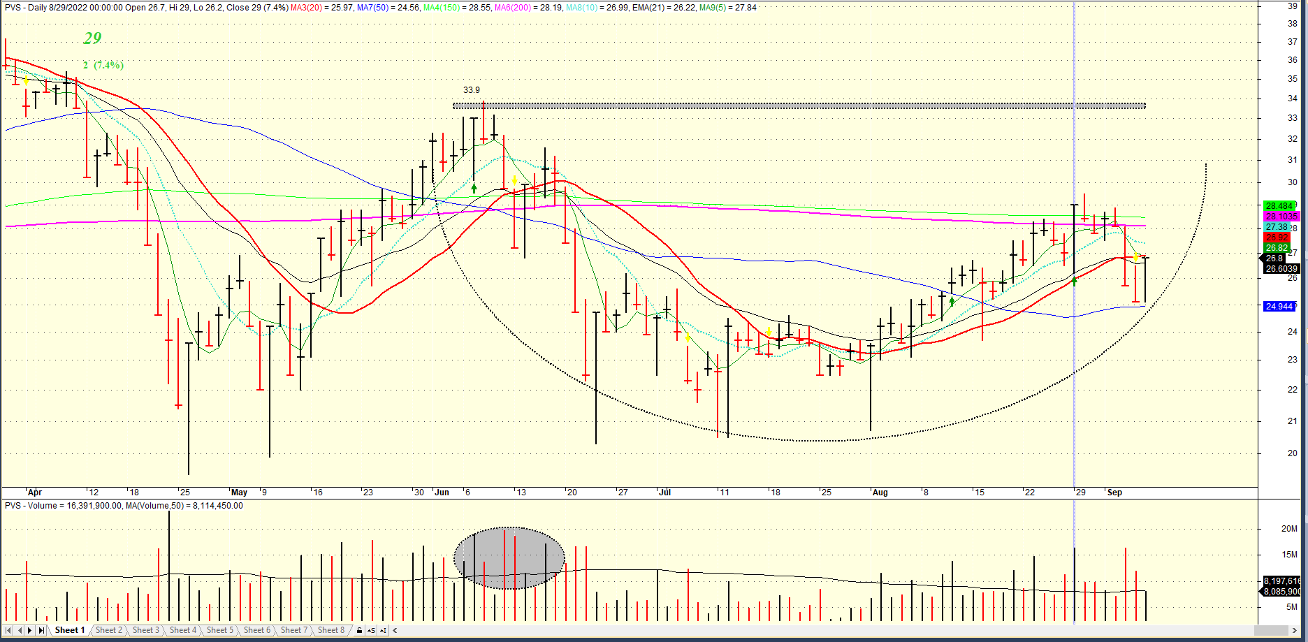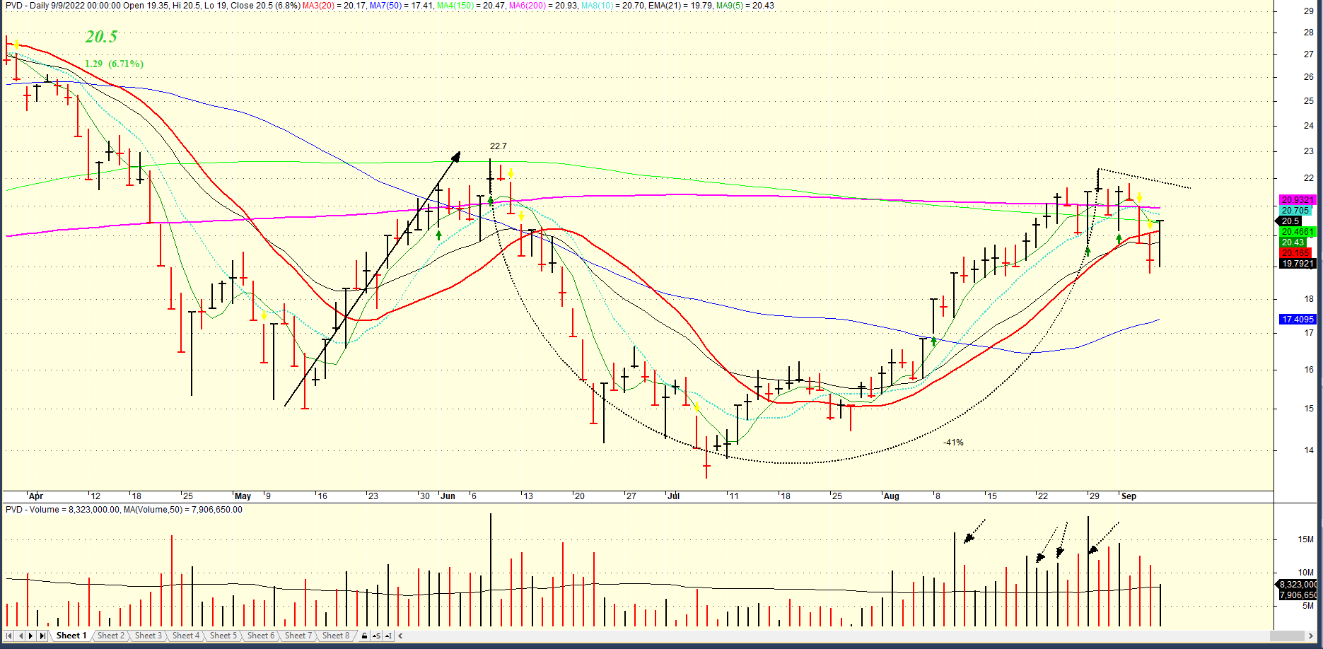 Cổ phiếu PVS thuộc nhóm dầu khí cũng bật tăng mạnh và đóng cửa ở mức cao nhất phiên 6.73%. Đợt giảm giá về MA50 ngày của PVS đi kèm với khối lượng khá lớn, hãy cẩn thận nguồn cung có vẻ vẫn còn khá nhiều.