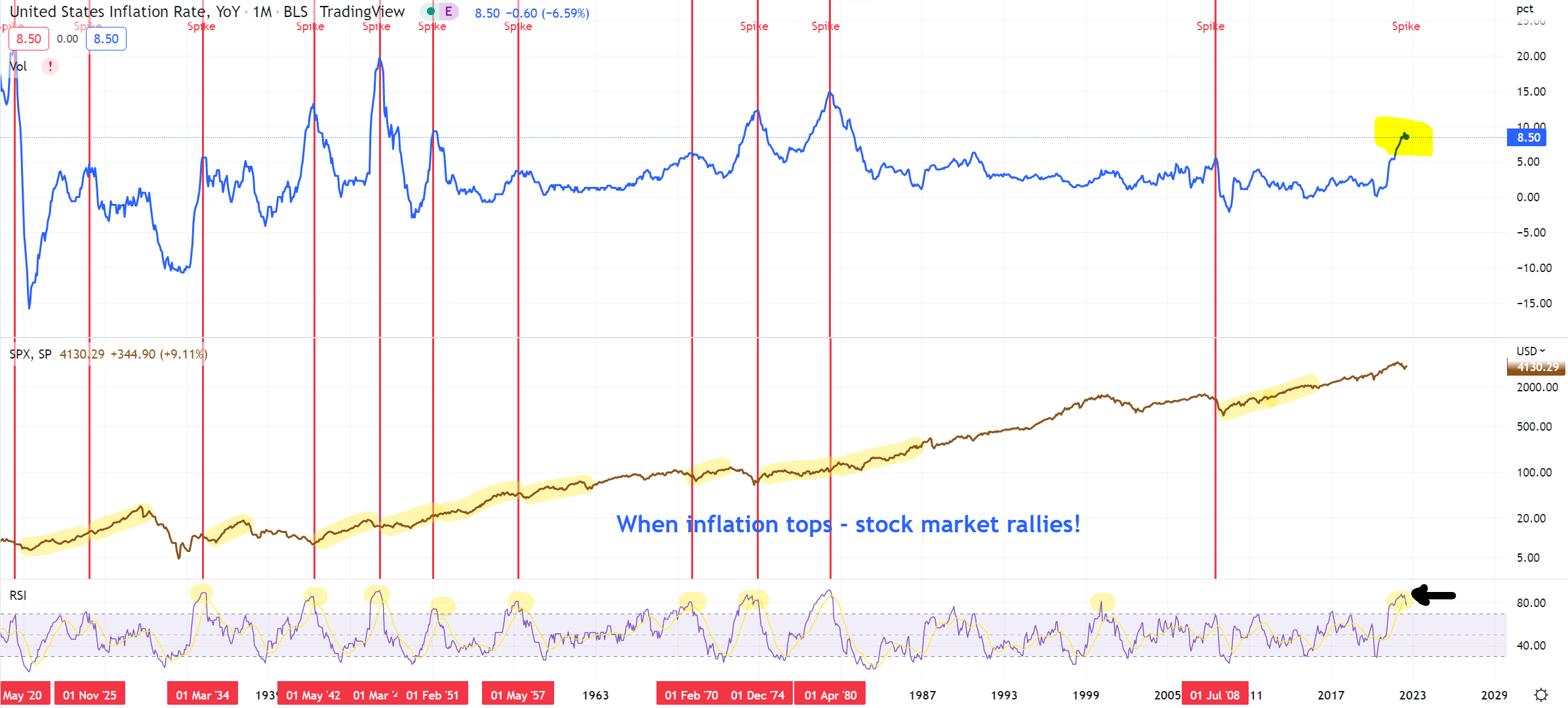 Lời bàn của admin: Đồ thị sau cho thấy câu nói “Đỉnh lạm phát, đáy chứng khoán”. Nếu dữ liệu CPI lần này tiếp tục đi xuống, thị trường chứng khoán sẽ tiếp tục tăng giá.