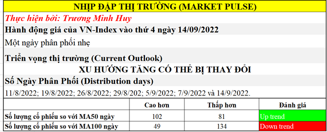Số ngày phân phối cao và VN-Index nằm dưới EMA 21 ngày nên triển vọng thị trường vẫn ở mức đèn vàng. Nhưng ngày hôm nay thật tốt là không có sự tàn sát nào cả. Chỉ số VN-Index vẫn giữ trên MA50 ngày và đóng cửa tại mức giá cao nhất ngày.