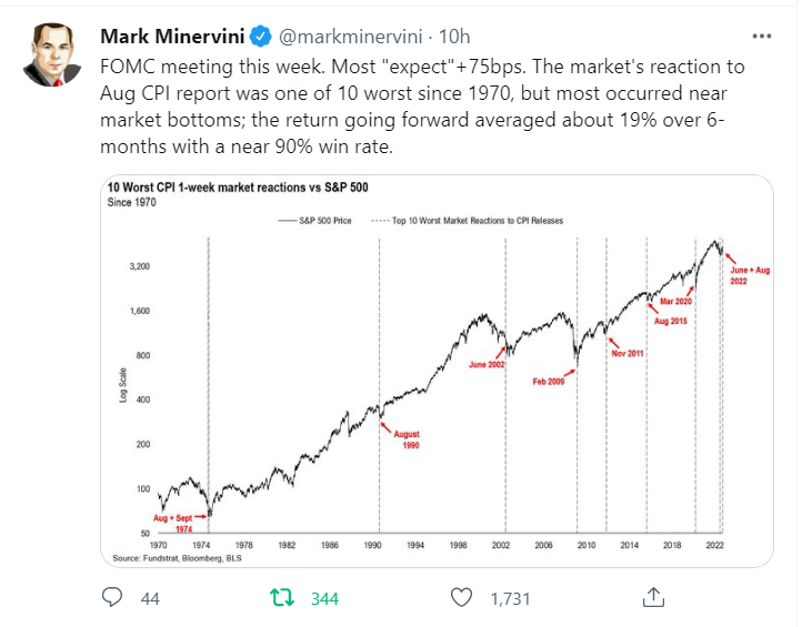 Trên mạng xã hội, phù thủy Mark Minervini nói rằng: “Phản ứng của thị trường với CPI tháng 8 vừa qua là một trong 10 phản ứng tồi tệ nhất kể từ năm 1970, và hầu hết đều diễn ra gần đáy thị trường. Tỷ suất sinh lợi trung bình là 19% trong 6 tháng sau đó, với tỷ lệ chiến thắng là 90%”. Phát biểu của Mark có khuynh hướng ngược với nhân định trước đó là “Cash is king và thị trường còn giảm thêm 10%-15% nuwaxx”.