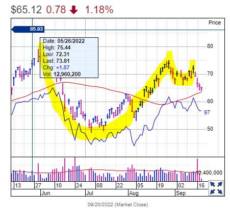 Devon Energy (DVN) vẫn đang xây tay cầm, nhưng bên bán đã đạp cổ phiếu này về sát MA50 ngày. (Lời bàn của admin, Devon đang giảm về MA50 20 ngày và cách đỉnh cao nhất bên trái tay cầm là gần -20%. Hãy chú ý đến khả năng thị trường hình thành các tay cầm rộng trông bối cảnh khủng hoảng).