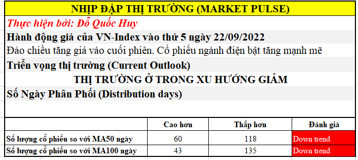 Theo quan điểm cá nhân của tôi, chỉ số VN-Index đã thủng MA50 ngày nhưng có quan điểm cho rằng đây chỉ có thể là nhiễu vì đáy của ngày 19/9 chưa bị vi phạm và bộ lọc nhiễu 2-3 ngày giao dịch sau khi chỉ số đóng cửa dưới MA50 ngày được áp dụng cho trường hợp này. Nếu chỉ số VN-Index bật tăng trong các phiên tới và giành lại MA50 ngày, triển vọng thị trường sẽ chuyển từ “Xu hướng giảm” sang “Xu hướng tăng có thể bị thay đổi” và lúc này số ngày phân phối được phép đếm lại.