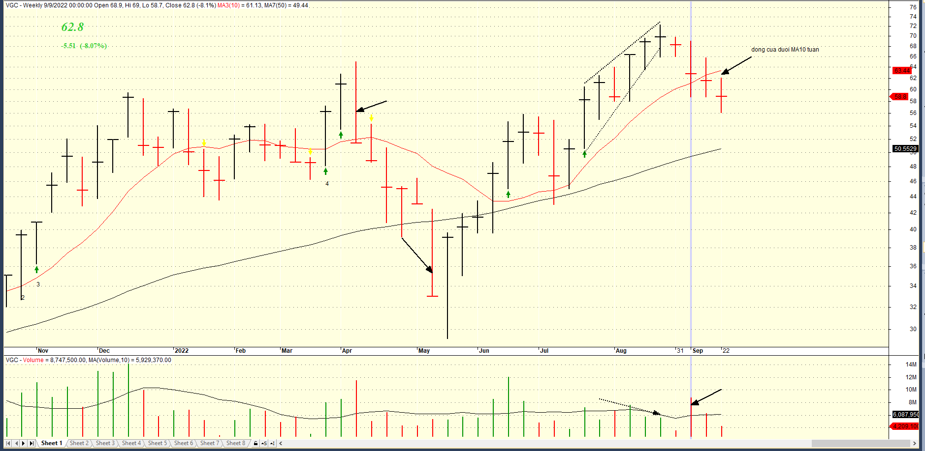 Cổ phiếu VGC có giai đoạn tăng giá vượt qua đỉnh cũ trước đó nhưng với khối lượng ngày càng thấp dần. Khi chúng tôi nối các đáy lại với nhau thì mẫu hình Cái nêm hướng lên đã xuất hiện trên cổ phiếu này. Sau khi phá thủng mẫu hình Cái nêm hướng lên bằng tuần giảm giá với khối lượng lớn, cổ phiếu VGC tiếp tục có tuần giảm giá đóng cửa dưới đường trung bình di động MA10 tuần đi kèm khối lượng lớn.