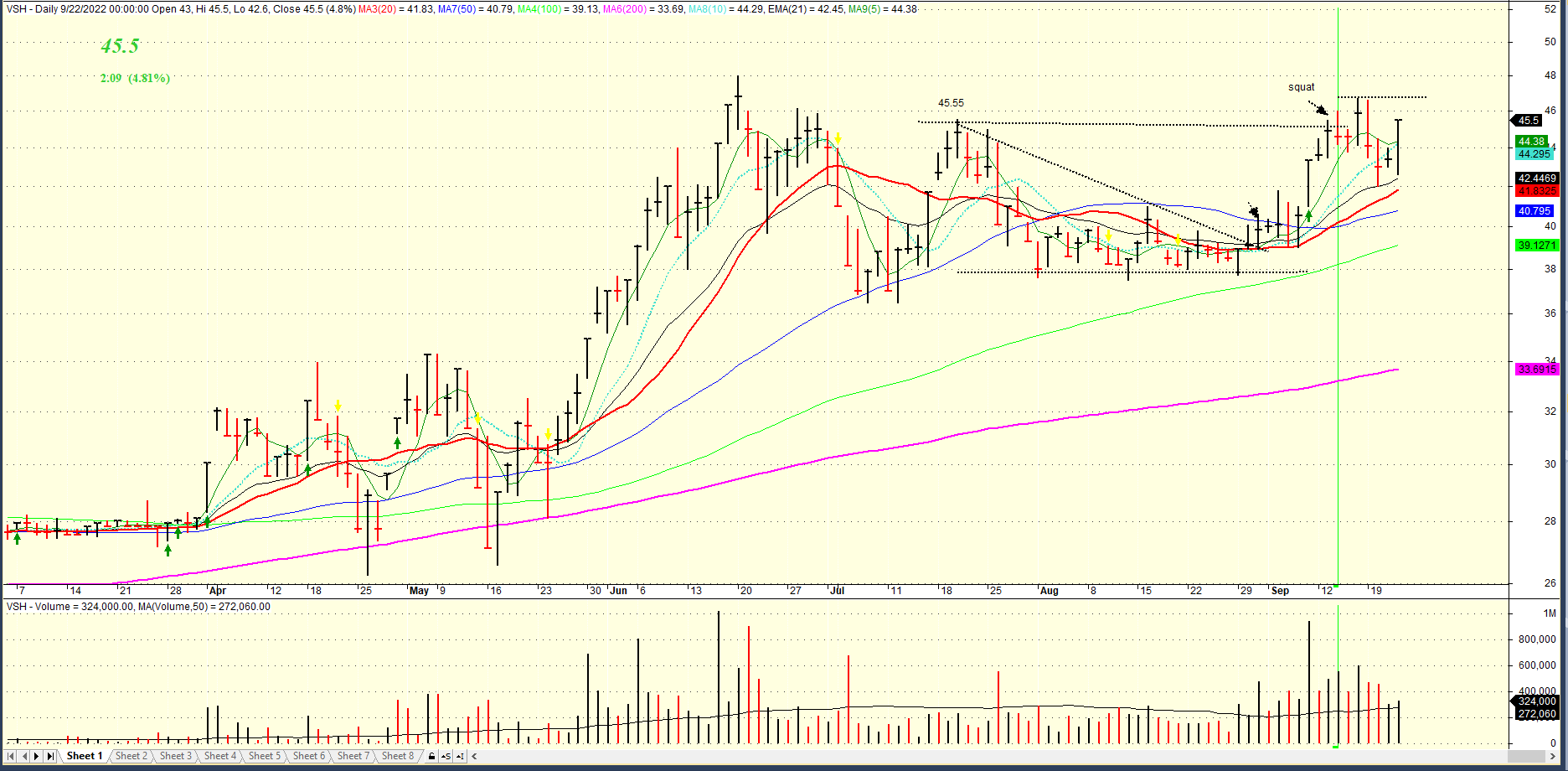 Cổ phiếu VSH cũng có phiên bật tăng khá tốt 4.81% sau khi có đợt kéo ngược về EMA21 ngày. Trước đó, cổ phiếu breakout mẫu hình Nền giá phẳng kéo dài trong 7 tuần nhưng bị kéo ngược trở lại bên trong nền giá. Sau NT2 thì VSH đang được kỳ vọng trở thành cổ phiếu dẫn dắt thứ hai của ngành điện, với kết quả kinh doanh ấn tượng trong Quý 2.2022 khi đạt mức tăng trưởng lợi nhuận 90.3%
