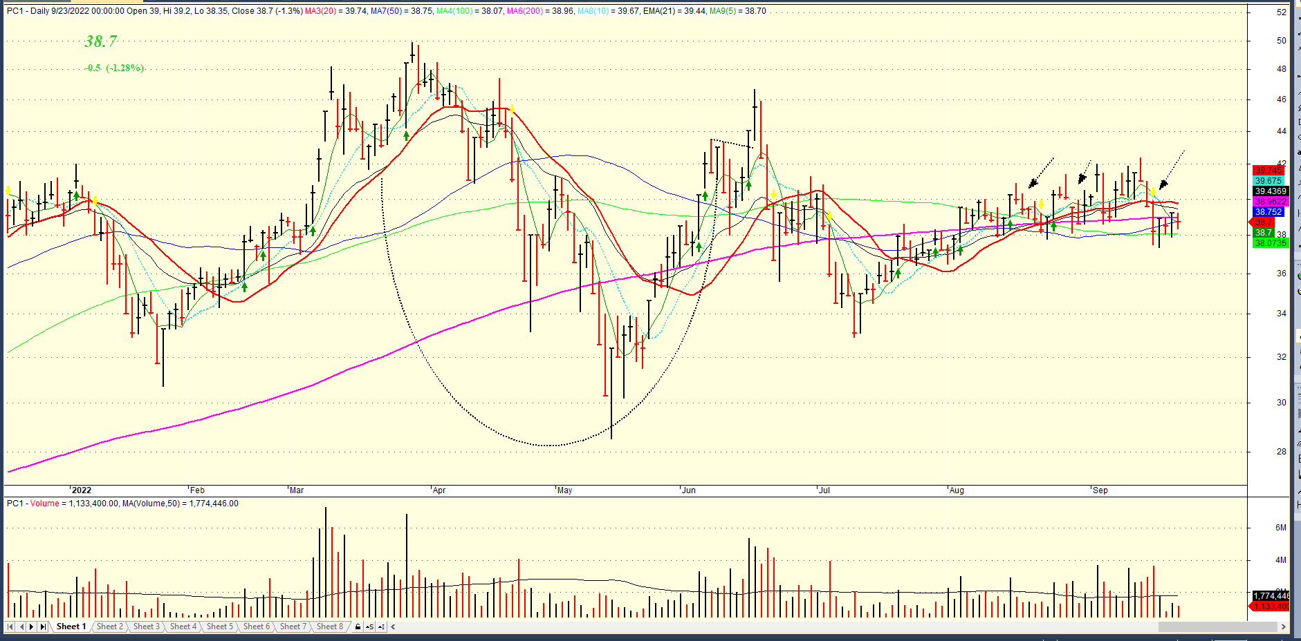 Cổ phiếu PC1 cũng thất bại trong việc phá vỡ nền giá và hình thành mẫu hình “Bát rượu độc của thần chết” vào giữa tháng 6.2022. Cổ phiếu có đợt tăng giá quá nhanh bên phần mạn phải của mẫu hình với 5 tuần tăng giá liên tiếp từ đáy, đợt tăng giá bên mạn phải không chậm lại mà còn quá gấp gáp khiến lượng cung treo lơ lửng trên đầu được hình thành bởi những người mua mắc bẫy giá cao vào đầu tháng 4 chưa kịp bị loại bỏ.