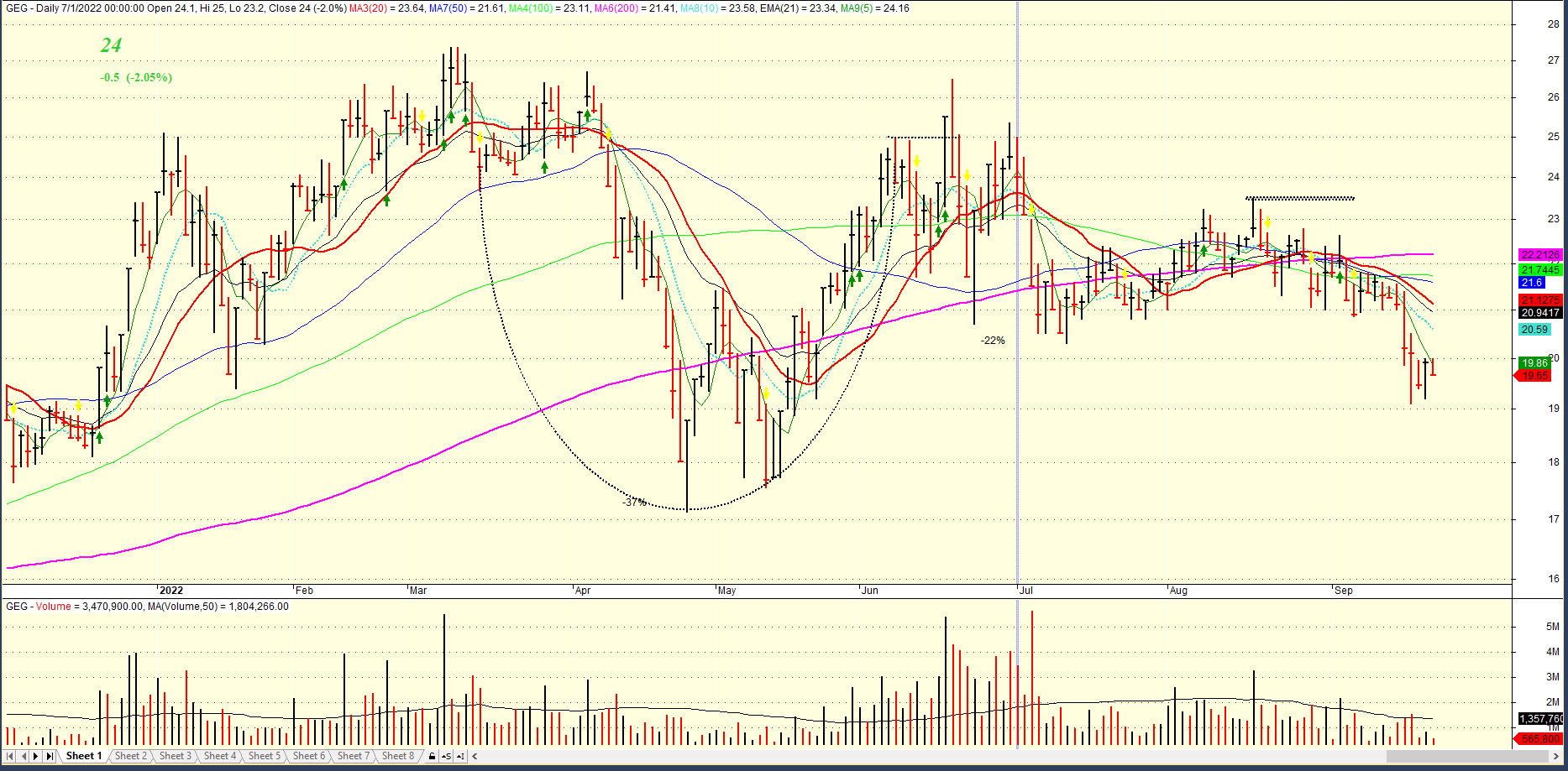 Nhìn trên đồ thị giá của các doanh nghiệp có lượng lớn điện tái tạo như GEG, PC1, HDG đều có vẻ “khá xấu”. Cụ thể cổ phiếu GEG sau khi breakout thất bại mẫu hình Chiếc Cốc tay cầm hình thành trong 14 tuần đã xuất hiện liên tục nhiều phiên giảm điểm mạnh với khối lượng lớn. Các đợt hồi phục trở lại MA50 ngày sau khi đánh mất đường trung bình di động này đều đi kèm với khối lượng thấp. Cổ phiếu có hai lần hồi phục vượt qua MA50 ngày nhưng sau đó nhanh chóng giảm điểm, xuyên thủng MA200 ngày và đồng thời xuất hiện sự kiện “Chữ thập chết chóc” – MA50 ngày cắt xuống MA200 ngày vào ngày 5.9.2022