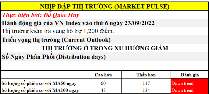 Chỉ số VN-Index kết thúc tuần giao dịch đầy biến động bằng ngày giảm giá gần 1% với khối lượng giao dịch lớn phiên hôm trước. Vì thị trường đã xác nhận vào “Xu hướng giảm giá” nên chúng ta không cần phải đếm các ngày phân phối. Chỉ số VN-Index có tuần giảm điểm mạnh nhất 2.5% tính từ khi thị trường chung đạt đỉnh vào cuối tháng 8 và đóng cửa dưới MA10 tuần.