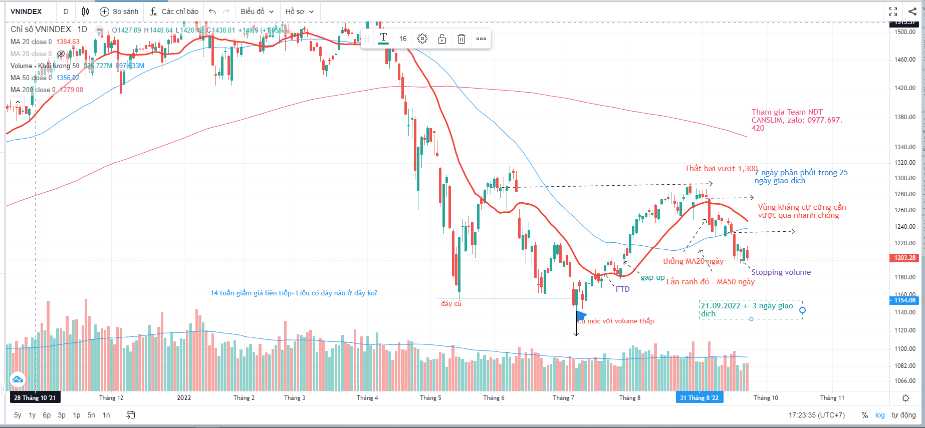 Cá nhân tôi vẫn giữ nguyên quan điểm, nếu chỉ số VN-Index chưa vượt được cây nến ngày 19/9 hay tối thiếu đóng cửa trên MA50 ngày thì Xu hướng hiện tại của thị trường vẫn là Downtrend. Thị trường có thể sẽ giảm về lại đáy tháng 7.2022 để rủ bỏ các tay chơi yếu trước khi quay trở lại tăng giá. Khu vực 1,140 – 1,160 điểm chính là cứ điểm quan trọng mà VN-Index không được xuyên thủng, nếu như điều đó xảy ra thì hãy tìm kiếm Đợt nỗ lực hồi phục.