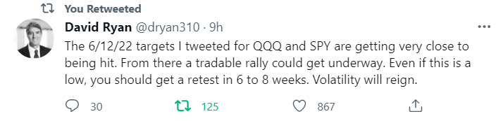 Đáng chú ý nhất là lời bàn của phù thủy David Ryan, vốn rất chuẩn xác trong năm nay. Ông ít khi twitter, mỗi năm đăng vài dòng, nhưng mỗi lần đăng là cực kỳ quan trọng. Ông nói: ‘Mục tiêu giá ngày 12/6/2022 mà ông đưa ra cho QQQ và SPY đã chạm tới. Có thể xuất hiện một đợt hồi phục. Thậm chí ngay cả khi đây là một đáy, vẫn có thể bị kiểm tra lại (retest) trong 6-8 tuần tới. Thị trường vẫn cực kỳ biến động mạnh.”