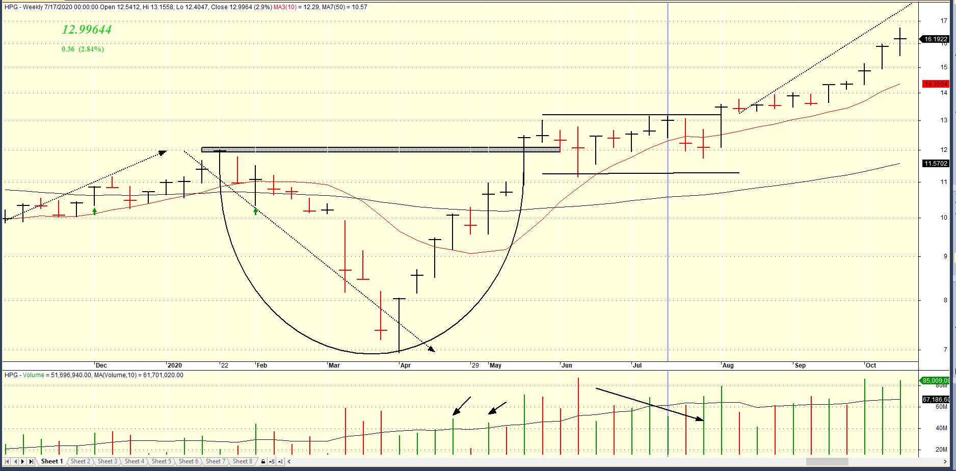 Cổ phiếu HPG sau đó không tăng giá lập tức và đi ngang trong khoảng thời gian khá dài hơn 9 tuần vì phải đối mặt với “lượng cung treo lơ lửng trên đầu” xuất hiện. Lượng cung này xuất hiện từ những người mua bị mắc bẫy giá cao trong xu hướng giảm và những người mua vô tình bắt được đáy muốn chốt lời.