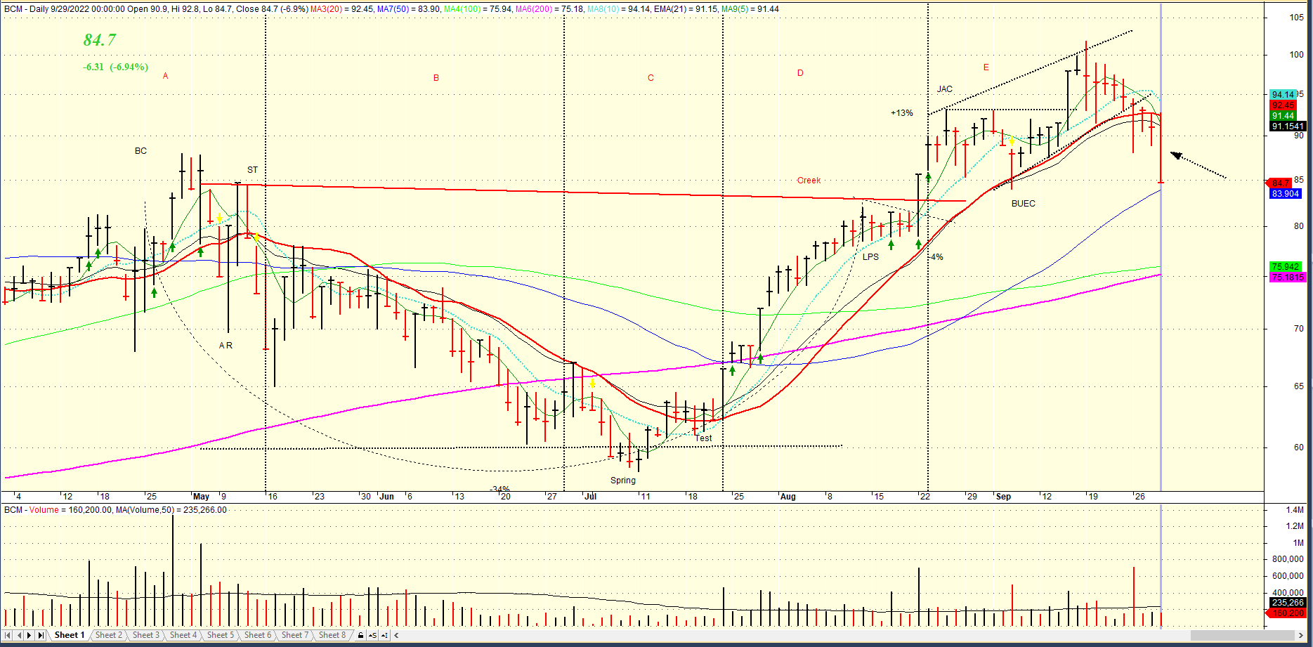 Cụ thể, cổ phiếu BCM thuộc nhóm BĐS KCN sau khi breakout mẫu hình Chiếc Cốc tay cầm và trở thành Leader của nhóm này đã có hành động giá không thực sự tốt. Cổ phiếu tăng giá đi lên nhưng thanh khoản thấp dần, hành động giá của cổ phiếu đã cho thấy mẫu hình Cái nêm hướng lên đang hình thành, phiên giao dịch hôm nay BCM chính thức có phiên giảm mạnh và xuyên thủng đường trendline phía dưới.
