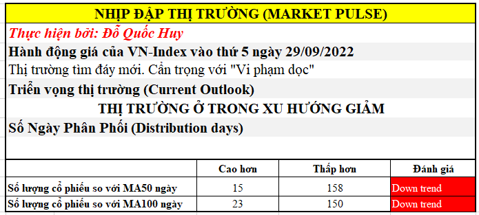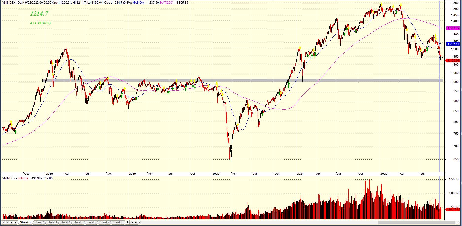 Chỉ số VN-Index đóng cửa ở mức thấp nhất phiên và giảm 1.54% với khối lượng giao dịch thấp hơn phiên hôm trước. Vùng hỗ trợ tại đáy tháng 7.2022 chính thức bị xuyên thủng và nhà đầu tư cần tìm kiếm lại đợt nỗ lực hồi phục mới.