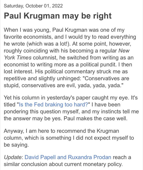 Đang có làn sóng chỉ trích FED đã không nhìn thấy được lạm phát và để mọi thứ vượt tầm kiểm soát. Giờ đây, FED thắng quá gấp điều có thể tạo ra cuộc suy thoái kinh tế. Các giáo sư kinh tế có tầm ảnh hưởng lớn như Paul Krugman, tay bút quen thuộc trên New York Times, hay Greg Mankiw, Đại học Harvard cho rằng FED THẮT CHẶT TIỀN TỆ QUÁ GẤP. http://gregmankiw.blogspot.com/2022/10/paul-krugman-may-be-right.html