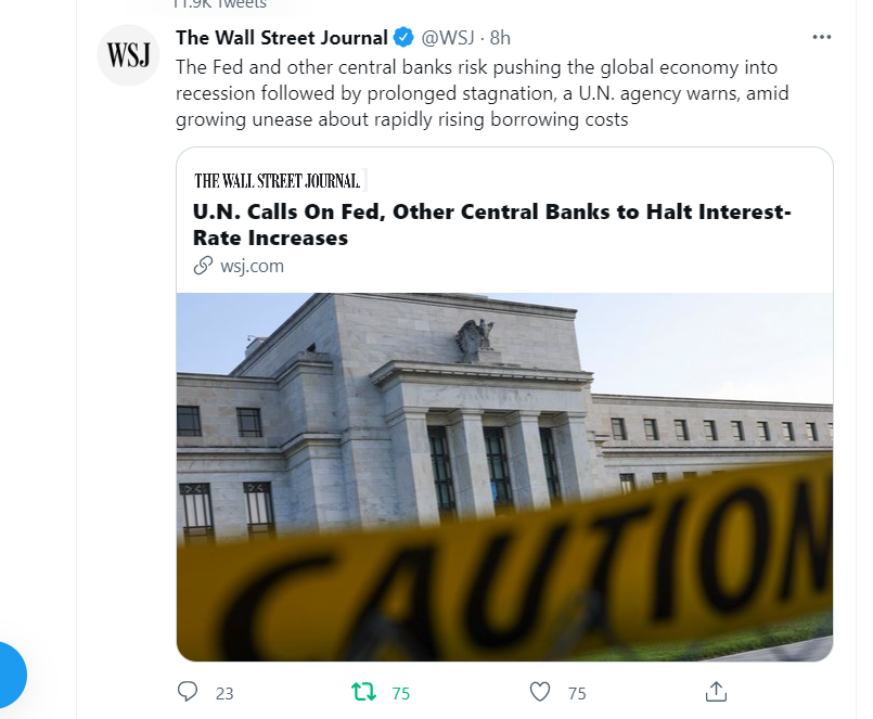Hôm qua, Liên Hợp Quốc đã có lời kêu gọi FED và các ngân hàng trung ương toàn cầu dừng việc tăng lãi suất quá nhanh. Thông tin được đăng tải trên Thời báo Wall Street Journal. Liên Hợp Quốc (UN) cho rằng, việc tăng lãi suất đã khiến các nước đang phát triển, ngoại trừ Trung Quốc, mất đi 3,600 tỷ đôla thu nhập. UN cảnh báo nguy cơ suy thoái kinh tế đối với toàn cầu. FED đã giảm 2% bảng cân đối tài sản của họ từ 8,960 tỷ đôla xuống 8,800 tỷ đôla.