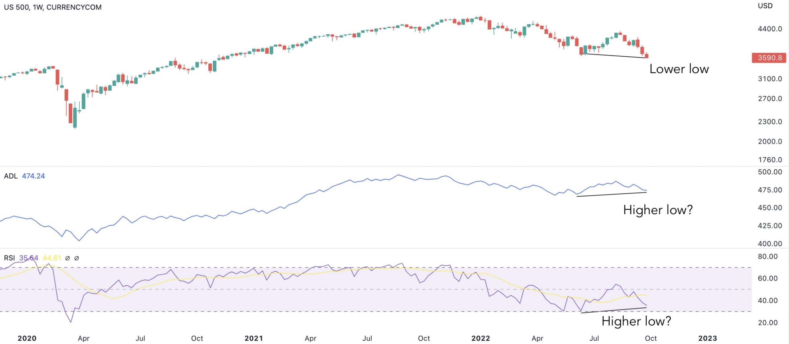 Hãy quan sát trên đồ thị tuần, chỉ số SP500 đang hình thành phân kỳ dương với các chỉ báo dao động như RSI
