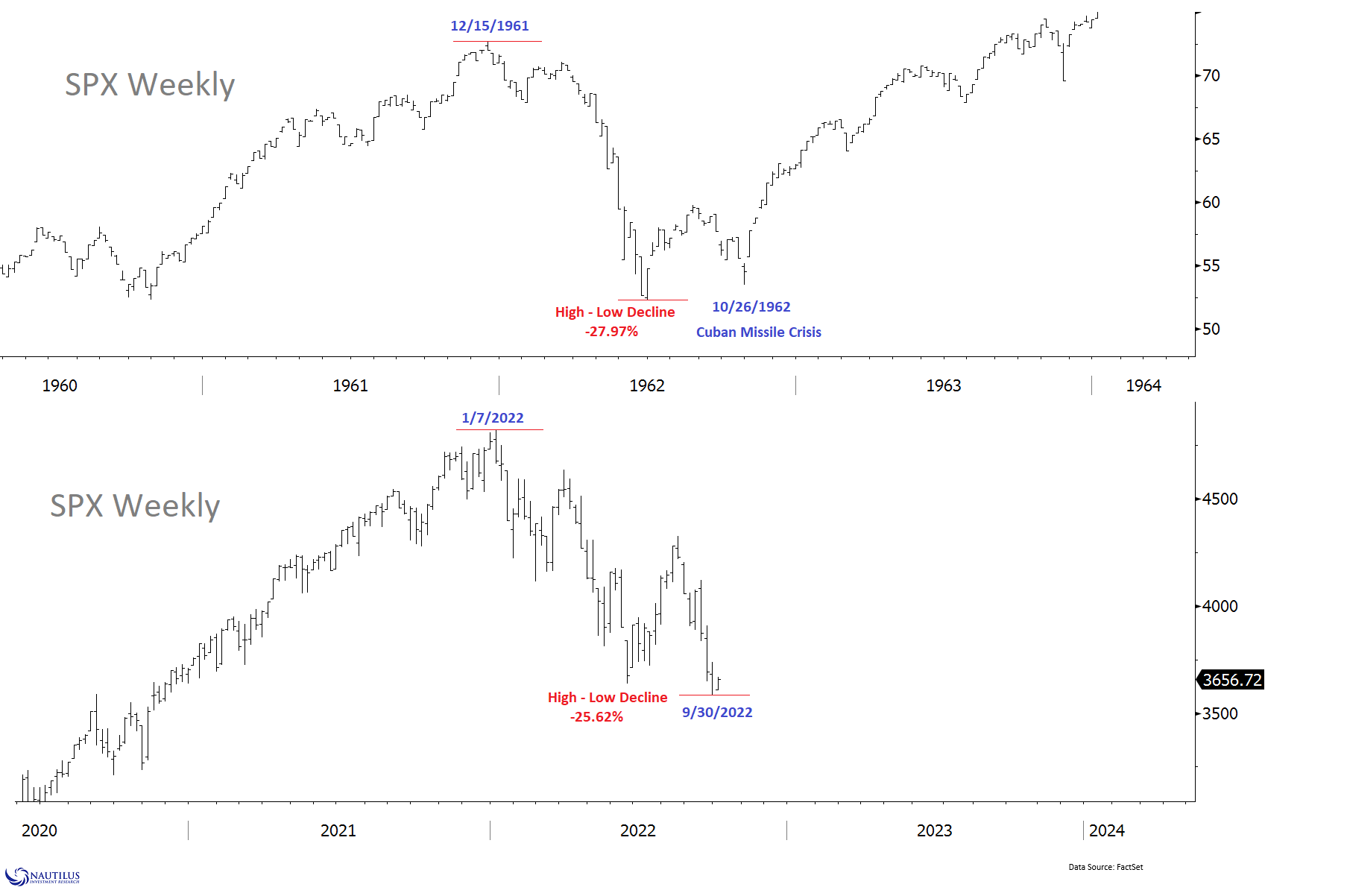 Liệu có một cú fake out như đã từng diễn ra vào năm 1961, khi FED tung ra Operation Twist để xoa dịu căng thẳng do khủng hoảng tên lửa Cuba. Đồ thị dưới cho thấy sự tương đồng của chỉ số SP500 tại hai thời điểm (đều có khủng hoảng địa chính trị, nhưng khác là năm 1961 không có lạm phát cao như hiện nay).