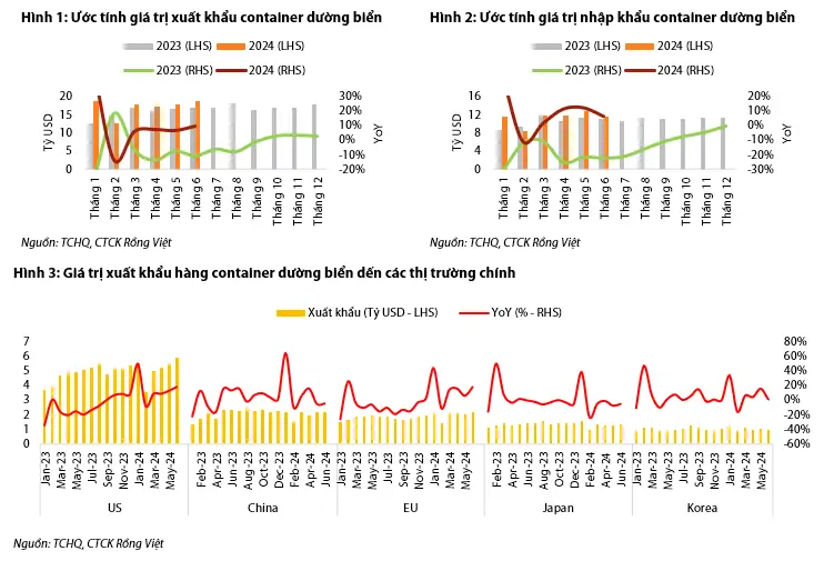 Trong tháng 06/2024, ước tính giá trị XNK container đường biển lần lượt đạt 19 tỷ USD (+10% YoY) và 12 tỷ USD (+6% YoY). Cụ thể: