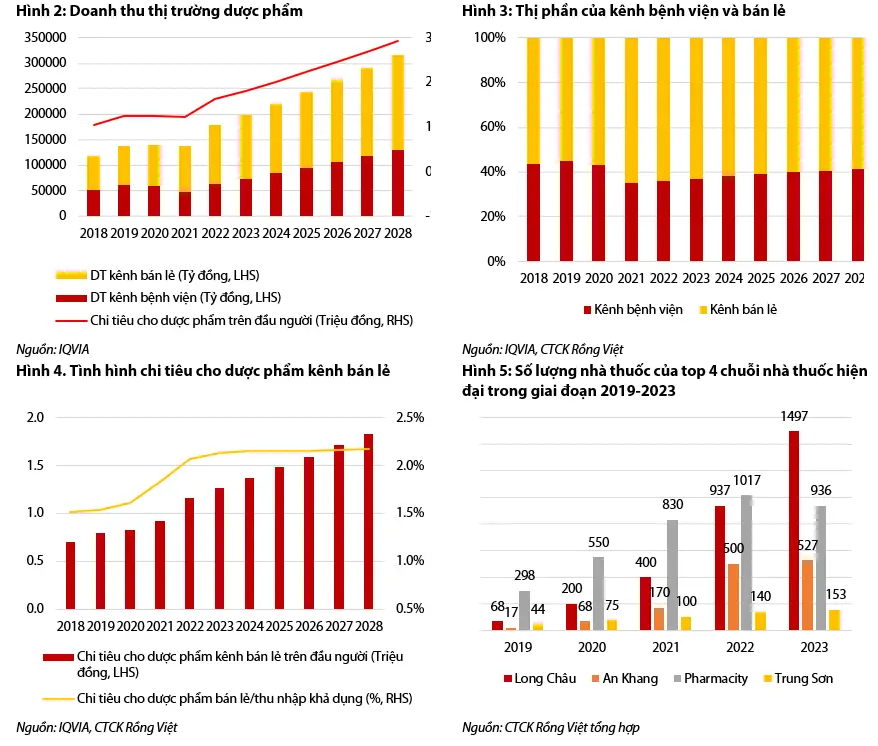 Theo dự phóng của IQVIA và của chúng tôi, doanh thu thị trường dược phẩm nói chung và kênh bán lẻ nói riêng sẽ lần lượt đạt 316,747 tỷ và 186,390 tỷ, tăng trưởng trung bình ở mức 9.7%/năm và 8.3%/năm cho tới 2028 (Hình 2). Kênh bán lẻ được dự phóng sẽ giảm thị phần trong tổng thị trường dược phẩm trong giai đoạn 2024-2028 do sự trỗi dậy của kênh bệnh viện được hỗ trợ bởi tỷ lệ bao phủ của BHYT tiếp tục gia tăng theo định hướng của Chính phủ và sự cải thiện về cơ sở vật chất của cả bệnh viện công và bệnh viện tư.