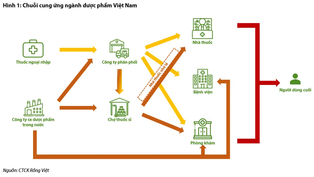 Có hai nguồn cung cấp dược phẩm tại Việt Nam: 1) thuốc được sản xuất bởi các doanh nghiệp sản xuất dược phẩm trong nước; và 2) thuốc ngoại nhập. Có ba kênh chính để thuốc đến tay người dùng cuối: nhà thuốc, bệnh viện và phòng khám (Hình 1).