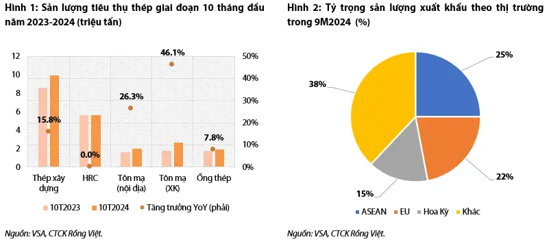 Dựa theo dữ liệu từ hiệp hội thép Việt Nam (VSA), năm 2024 đánh dấu sự phục hồi về sản lượng của thị trường thép xây dựng Việt Nam, khi sản lương tiêu thụ ghi nhận mức tăng trưởng tương đối tốt và đạt 15.8% YoY, hỗ trợ bởi sự phục hồi của hoạt động xây dựng dân dụng và hạ tầng. Các sản phẩm thép dẹt cho hoạt động xây dựng (Tôn mạ, ống thép) duy trì tăng trưởng sản lượng, ngoài từ nhu cầu nội địa còn ghi nhận nhu cầu từ thị trường nước ngoài, với sản lượng tôn mạ xuất khẩu ghi nhận mức tăng trưởng ấn tượng ở 46.1%YoY (các thị trường lớn bao gồm ASEAN, EU và Hoa Kỳ).