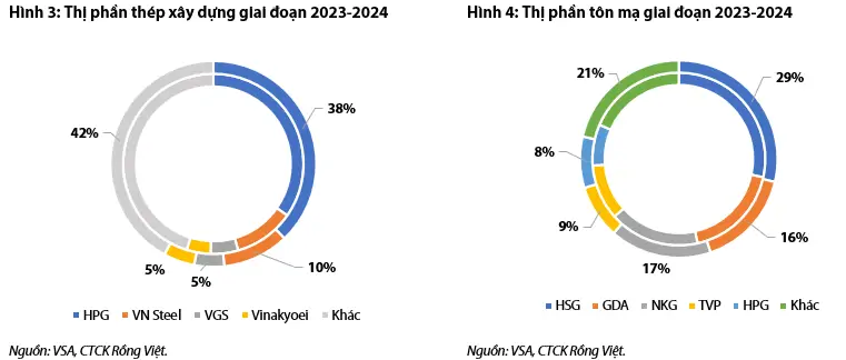 Về thị phần thép xây dựng, HPG đã gia tăng thị phần từ mức 38% (so với 35% trong 2023) nhờ tăng sản lượng tại các các dự án hạ tầng, đồng thời đẩy mạnh xuất khẩu sang các thị trường khác (ASEAN,…). Thị phần tôn mạ có xu hướng giữ ổn định, với các công ty có thị phần lớn nhất gồm HSG, NKG và GDA.