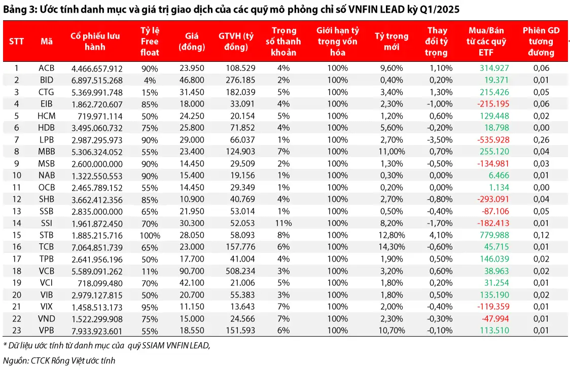 Giống như rổ VN30, trong kỳ cơ cấu lần này, danh mục chỉ số VNFIN LEAD sẽ được tính toán lại các chỉ số thành phần. Kết quả tính toán đến ngày 31/12/2024, ước tính danh mục chỉ số VNFIN LEAD sẽ không có sự thay đổi về cổ phiếu thành phần mà chỉ có điều chỉnh tỷ trọng danh mục cổ phiếu.