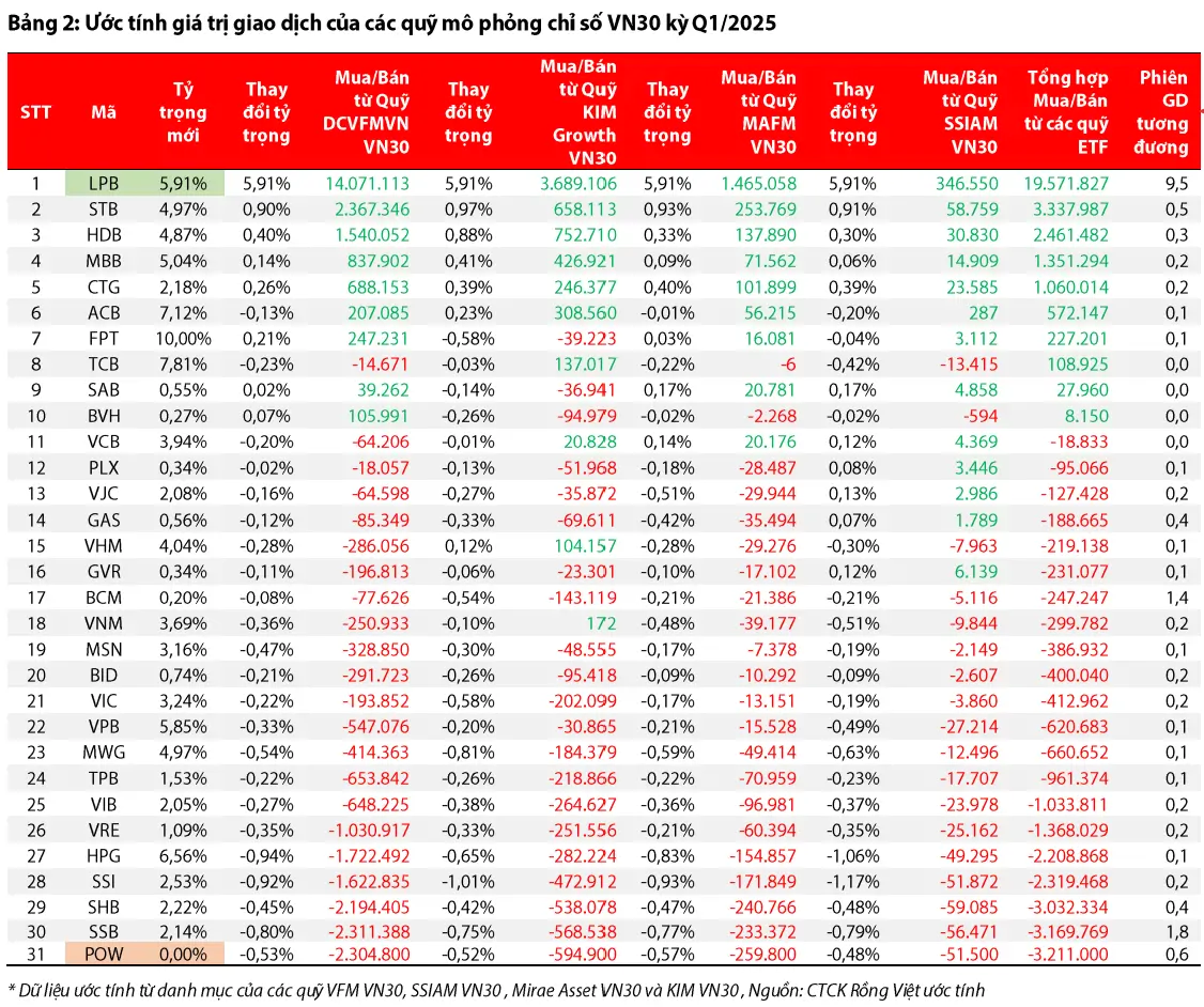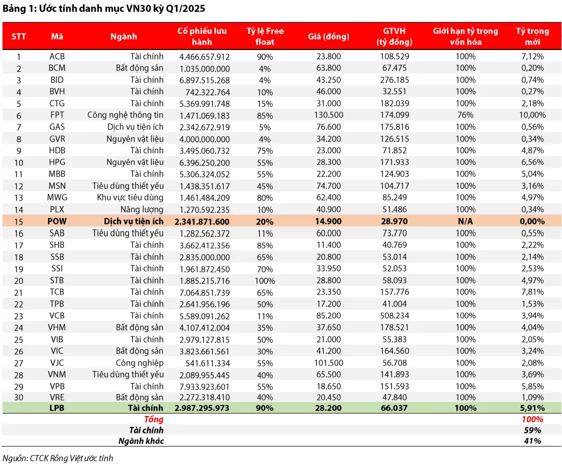 Dựa trên số liệu tính toán đến ngày 30/12/2024, chúng tôi ước tính chỉ số VN30 sẽ thêm mới cổ phiếu LPB và loại ra cổ phiếu POW. Cụ thể như sau: