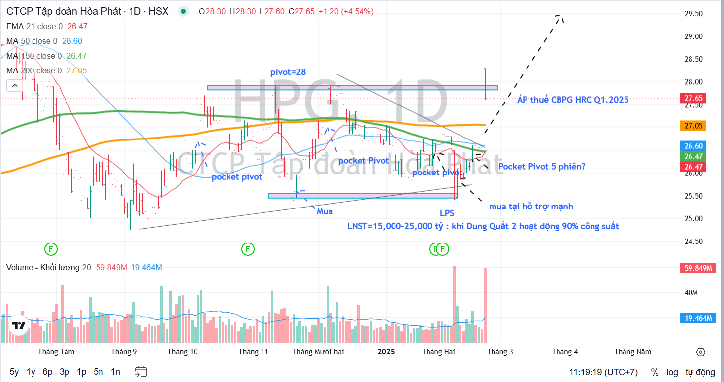 Trước những thay đổi đáng kể về chính sách mới tại Trung Quốc cùng sự ấm lên của thị trường BĐS nội địa và thông tin tích cực từ thuế CBPG sớm hơn dự kiến, VCBS điều chỉnh nâng dự phóng lợi nhuận của HPG cho năm 2025F/26F lần lượt đạt 16,350 và 21,5315 tỷ đồng. VCBS cho rằng tiềm năng cải thiện lợi nhuận có thể tốt hơn nữa trong kịch bản giá thép hồi phục mạnh hơn dự kiến. VCBS (21.2.2025) duy trì khuyến nghị MUA từ báo cáo triển vọng năm 2025 với HPG và nâng giá mục tiêu lên 38,000 đồng/cp.