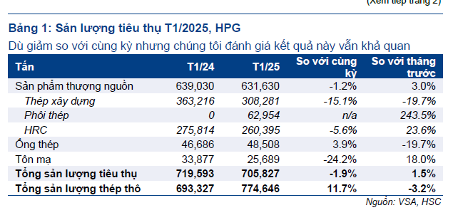 ✅HPG bán tổng cộng 705,827 tấn thép thành phẩm trong tháng 1/2025, giảm 2% so với cùng kỳ nhưng tăng 2% so với tháng trước. HSC cho rằng đây là KQKD tích cực, xét đến việc tháng 1 năm nay có ít hơn 7 ngày làm việc so với tháng 1/2024 do kỳ nghỉ Tết đến sớm.