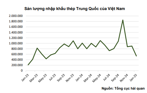 Điểm tích cực đến từ việc thép HRC Trung Quốc đã có dấu hiệu giảm xuất khẩu vào VN trong trong tháng 1.2025, cụ thể, mức xuất khẩu thép vào VIệt Nam chỉ đạt 537 nghìn tấn, giảm so với mặt bằng 800 nghìn đến 1 triệu tấn thép mỗi tháng trước đó. Điều này giúp cho sản lượng tiêu thụ HRC nội địa khởi sắc trong bối cảnh xuất khẩu hụt hơi.