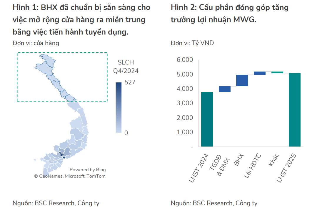 Tương tự, BSC (26.2.2205) kỳ vọng MWG duy trì đà tăng trưởng +34% yoy, tương ứng lợi nhuận năm 2025 đạt 5,040 tỷ, ghi nhận mức đỉnh lợi nhuận từ khi thành lập, nhờ BHX trở thành động lực tăng trưởng mới của MWG. Ban lãnh đạo kỳ vọng mở mới 200-300 cửa hàng BHX trong năm 2025, trong đó 70% tập trung ở miền trung.