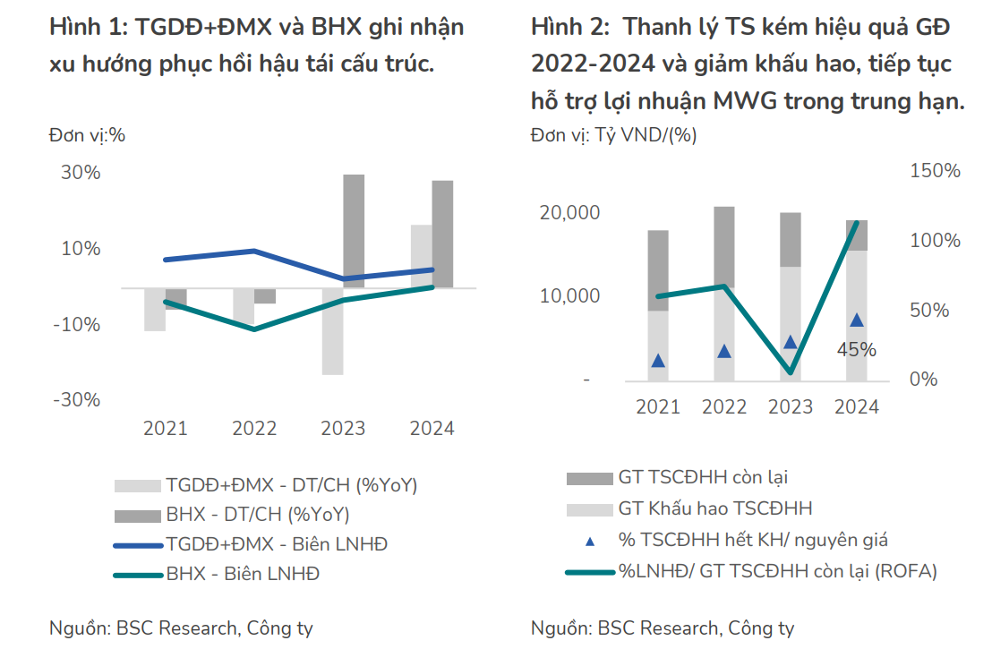 SSI (26.2.2025) kỳ vọng MWG vẫn tăng trưởng tích cực với lợi nhuận ròng năm 2025 dự báo đạt 5,190 tỷ đồng (+39% svck). Động lực tăng trưởng bao gồm: (1) chu kỳ thay mới điện thoại; (2) mạng lưới cửa hàng và biên lợi nhuận chuỗi Bách Hóa Xanh được mở rộng; (3) không còn ghi nhận chi phí bất thường; và (4) kết quả kinh doanh tốt hơn từ chuỗi công nghệ & điện máy tại Indonesia, chuỗi nhà thuốc và chuỗi Mẹ & Bé..