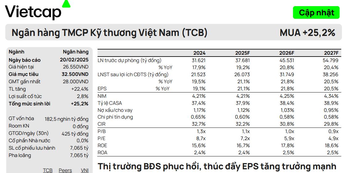 Vietcap (20.2.2025) duy trì khuyến nghị MUA và điều chỉnh tăng 16.1% giá mục tiêu lên 32,500 đồng/cổ phiếu.