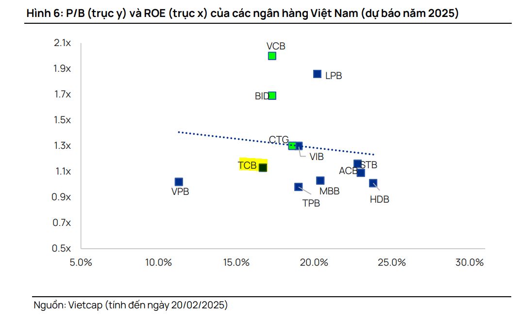 Theo Vietcap, TCB hiện đang giao dịch với P/B dự phóng năm 2025 là 1.11x, thấp hơn 4% so với P/B dự phóng trung vị của ngành trong năm 2025 là 1.15x, với ROE 2025F là 16.7% so với mức trung vị của ngành là 19.0%. TCB đang giao dịch với P/B trượt ở mức 1.27x, thấp hơn P/B trung bình 5 năm là 1.33x.